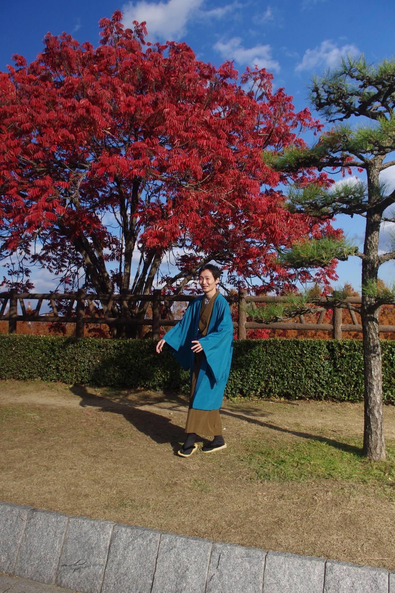 途中、紅葉が以上に美しいポイント(玉造口手前の坂のところ)があり、多くの外国人観光客が集まってワイワイと記念撮影していましたので、日本人が来たぞという雰囲気を醸し出しながらその中に紛れてきました。一番おもしろい感じで取れた1枚を掲載しておきます。